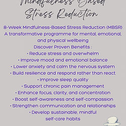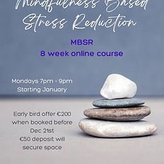 Are you... struggling with stress &/or anxiety? struggling to find the joy in life? feeling stuck or unsure of what way to turn next? feeling there has to be more to life? If any of those questions are a yes then this is the MBSR MINDFULNESS BASED STRESS REDUCTION COURSE for you. ✅ This is the exact programme that changed MY LIFE! ✅ What can this course help with? Stress Fibromyalgia Cardio Vascular Anxiety Depression Cancer Chronic Pain Sleep Disorders Psoriasis ✅ Who is this course for? This programme is for you if you are experiencing stress relating to overwhelm, anxiety, pain, burnout, trauma & other life events, from minor to major. This course is for you if you want to commit to making a meaningful difference in your well-being & those your share your life with. ✅ MBSR ~ What is it? Based on a world renowned, evidence based programme founded by Jon Kabat-Zinn, this 8 week online course aims to improve emotional well-being & reduce stress & anxiety. A number of simple practices are taught by fully qualified & highly trained tutors. These practices may help you feel more at ease with yourself & your life. You are taught to recognise habitual, automatic reactions that may not serve you & respond to your own thoughts & emotions in a less judgmental & more compassionate way. ✅ What does this MBSR course entail? This a a highly structured, scientifically backed programme & involves ✅ 2 hour online session once a week for 8 weeks ✅ A full day in person retreat day ✅ Daily home practice once a day for minimum 45 mins a day - it is ok to start small & build up, but a definite commitment is required. ✅ Comprehensive, yet easy to follow handbook to support you ✅ Mindfulness practices that include a variety of meditations ✅ Gentle yoga & body movement exercises ✅ Interactive exercises to develop mindful awareness & presence ✅ In depth learning of the principles of mindfulness & guidance on integrating some of the ideas & practices into your everyday life Dates : Starting 12th Jan 2026 Times : Mondays 7-9pm Location : Online weekly Monday evening classes with 1 day in person retreat in Dublin Investment : €250 - book before 21/12 for EARLY BIRD Discount and save €50 by paying just €200.